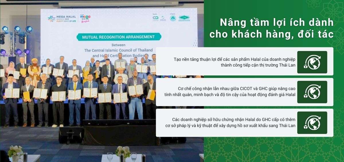 Việc được CICOT công nhận trong khuôn khổ MRA khẳng định năng lực chuyên môn, tính khách quan và hệ thống đánh giá Halal của GHC phù hợp với yêu cầu Halal của thị trường Thái Lan. Đồng thời, GHC phối hợp với CICOT trong hoạt động đánh giá sự phù hợp, bảo đảm các sản phẩm Halal dự kiến lưu hành tại Thái Lan đáp ứng đầy đủ tiêu chuẩn Halal do CICOT ban hành.
