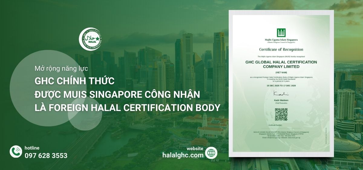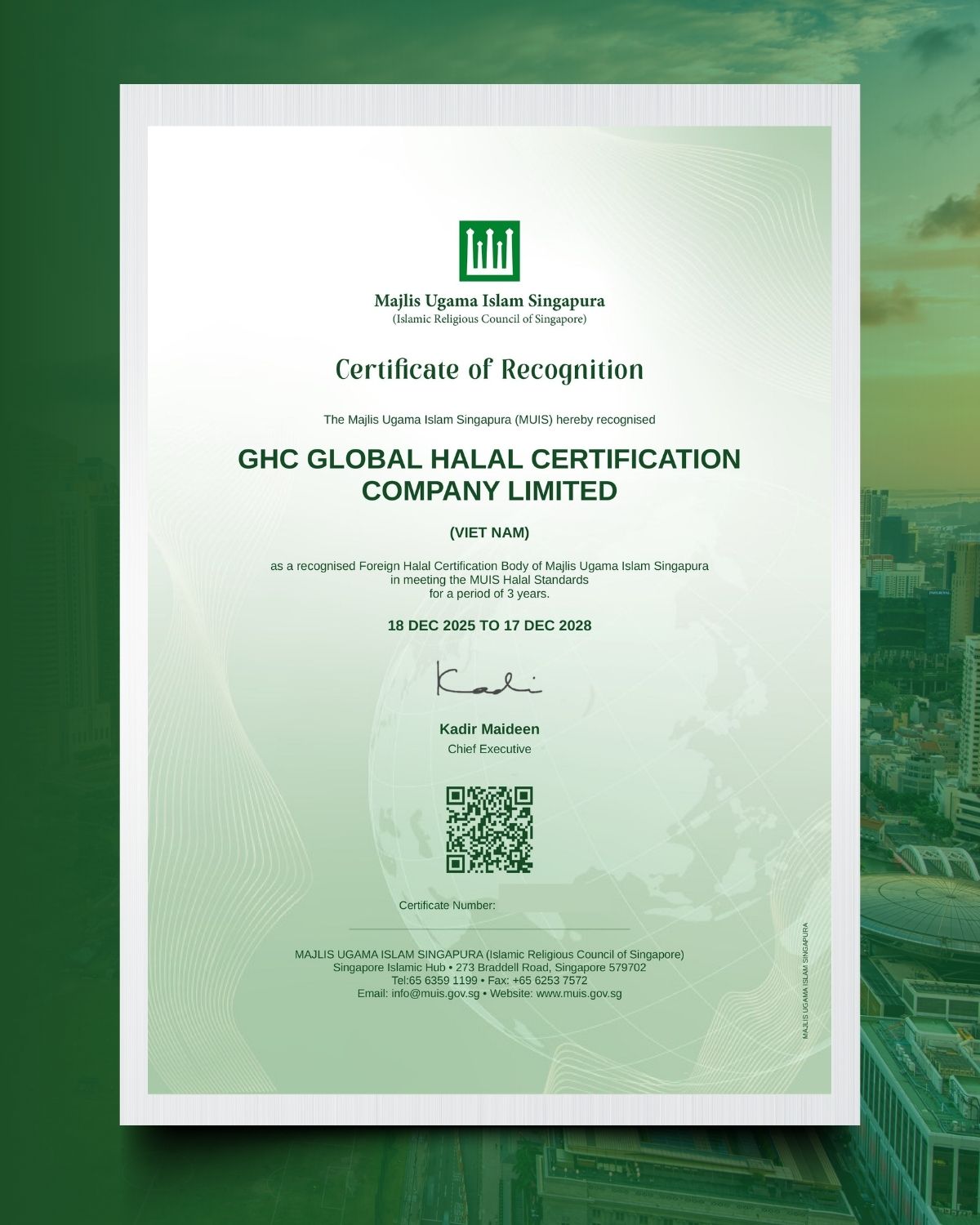 Vừa qua, GHC đã chính thức được công nhận với tư cách là Foreign Halal Certification Body - FHCB theo chương trình công nhận tổ chức chứng nhận Halal nước ngoài của MUIS. Việc được MUIS công nhận cho thấy hệ thống quản lý, quy trình đánh giá và hoạt động chứng nhận Halal của GHC đáp ứng các yêu cầu nghiêm ngặt theo tiêu chuẩn Halal Singapore, đồng thời phù hợp với cơ chế quản lý Halal đối với các sản phẩm được sản xuất ngoài lãnh thổ Singapore.