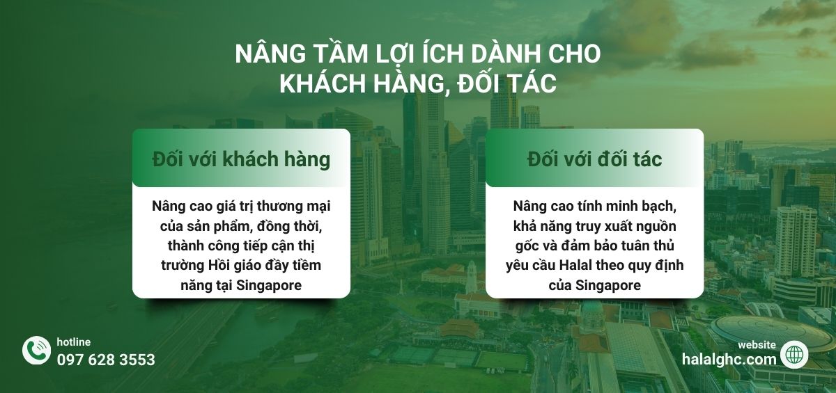 Đối với khách hàng sử dụng dịch vụ chứng nhận Halal của GHC: Hỗ trợ doanh nghiệp thành công tiếp cận thị trường Hồi giáo đầy tiềm năng tại Singapore, tăng độ tin cậy đối với đối tác và nhà nhập khẩu quốc tế và gia tăng giá trị thương mại cho sản phẩm Halal.