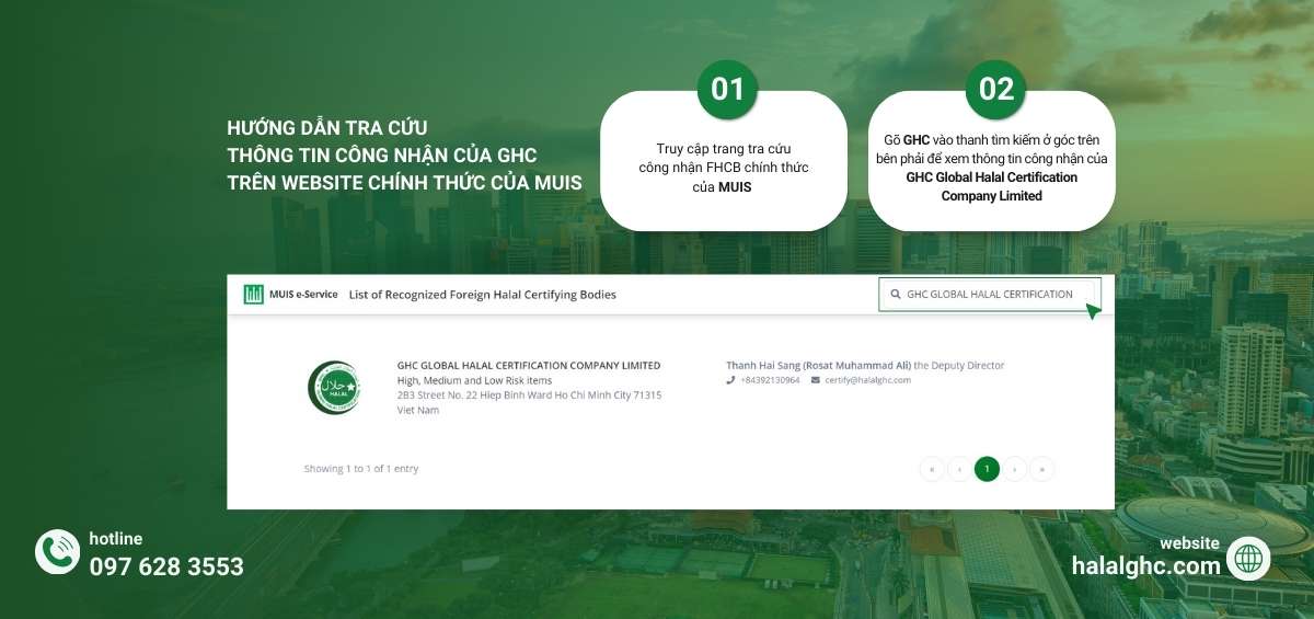 Thực hiện theo các bước sau, quý khách có thể dễ dàng tra cứu và xác minh việc GHC đã được MUIS Singapore công nhận với tư cách Foreign Halal Certification Body (FHCB).